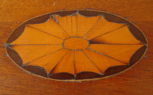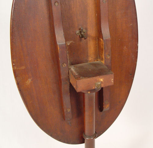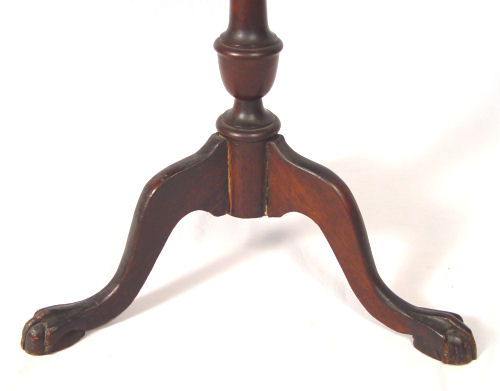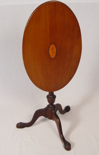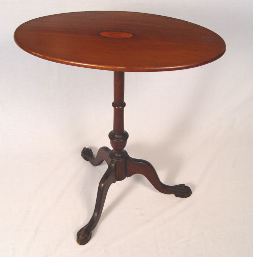 19TH CENTURY INLAID CANDLE STAND: Oval tilt top table with patera center. Ball and claw mahogany tri-footed base. 27''h., the oval is 26'' x 13 1/2''.