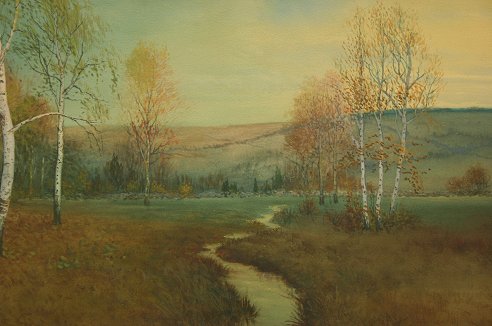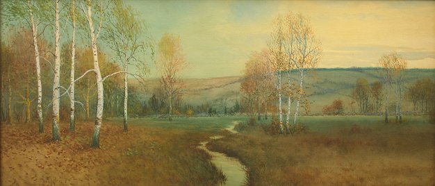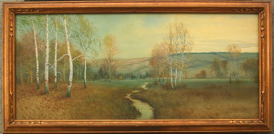 GAY, George Howell (American, 1858-1931): Panoramic Meadow Landscape, Watercolor and Gouache, 16'' x 37 1/2'', signed, original carved and gilded frame with minor wear, 19 1/2'' x 41 1/2''. Est. $800/1200**