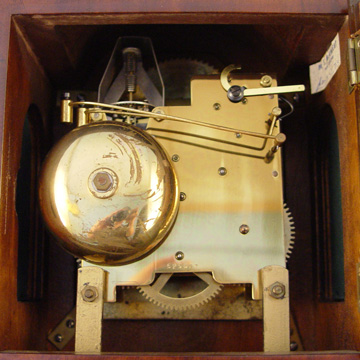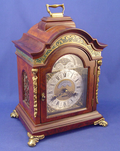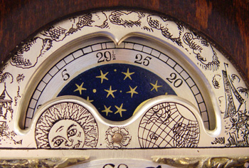 DECORATIVE MOONPHASE SHELF MANTLE CLOCK: Mid 20th century. J.A.W. sticker inside back door. Key wound. Metal face with roman numerals, date and moonphase dial above face. Wood case with metal decoration measures 11 1/2'' tall x 8 3/4'' wide x 6 1/2'' deep. Face measures 4 1/2''.