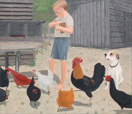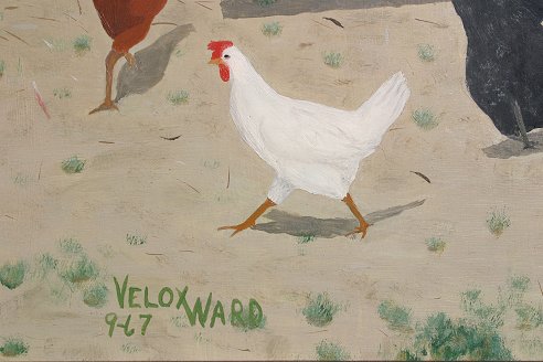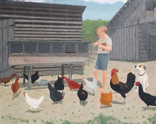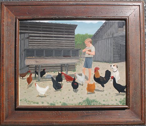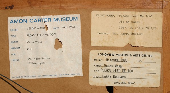 WARD, Velox Benjamin, (American, 1901-): ''Please Feed Me'', Oil/Masonite, 16'' x 20'', signed and dated 1967, encased in barn wood style frame, 24'' x 28'', Exhibition label from Amon Carter Museum, exhibited May 1972, also exhibited at the Longview Museum and Art Center in October 1980. Formerly in the collection of Mr. Harry Bullard. Est. $8000/12000**