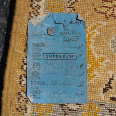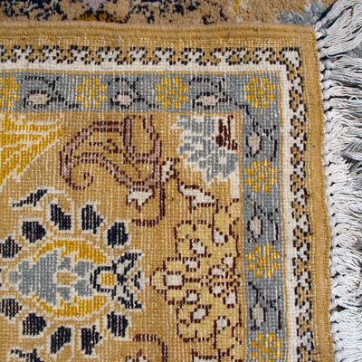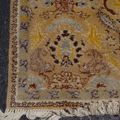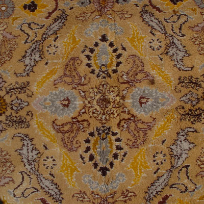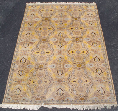 LARGE HAND TIED GOLD/BEIGE MEDALLION CARPET: Approx. 6'6'' x 9'10'', thick pile, geometric design with browns and grays.
