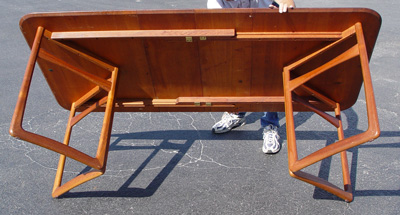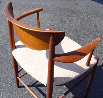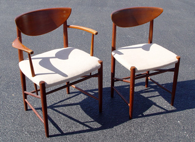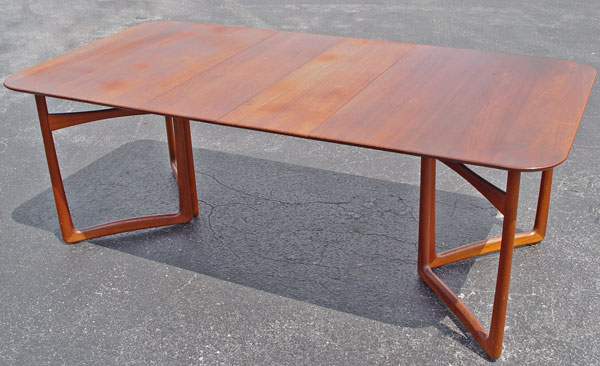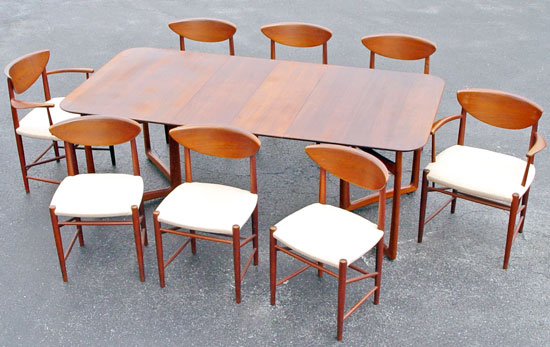 FRANCE & DAVERKOSEN PETER HVIDT DANISH DINING TABLE & 8 CHAIRS: Table with matched set of 8 chairs. The TABLE has two leaves and bears the France & Daverkosen medallion, 28 1/2''h. x 55 1/2'' x 39 1/2'', the leaves are 12'' each. The set of CHAIRS include 2 arm chairs, 29 1/2'' and 30 1/2''h.