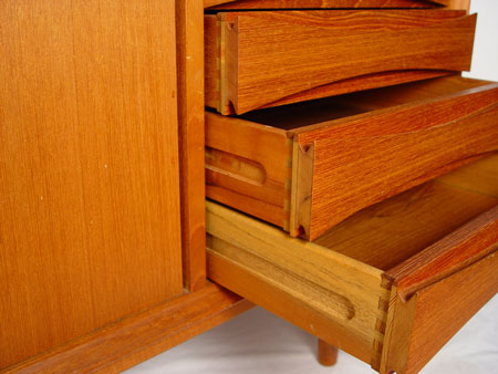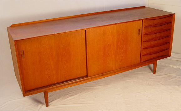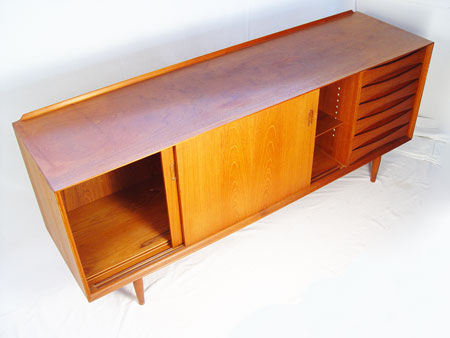 TEAK DANISH MODERN CREDENZA: Sliding doors cover shelved interior, 6 drawers down the front. In used condition. 30''h. x 72''long x 19 1/2''.