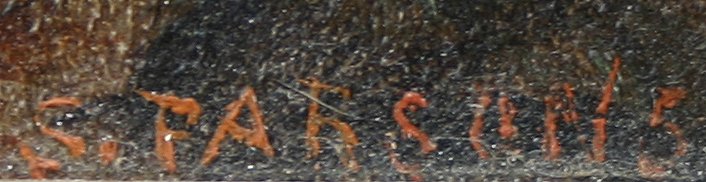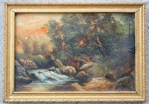 WESTERN RIVER LANDSCAPE, OIL/B, CIRCA 1890: 6'' x 9'', period gilded frame with wear and over-paint, 7'' x 10'', signed S. Parsons, possibly an early work by Sheldon Parsons. Needs cleaning with one fleck visible and several spots of in-paint. Est. $600/900**