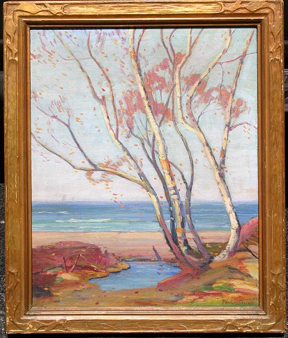 GREASON, Pearl, (American, 20th C.): Lakeside Landscape, Oil/Canvas, 26 1/4'' x 21'', carved, gilded gesso impressionist frame, 30 1/2'' x 25 1/2''. This work is from the same estate as the William Greason piece. Pearl was the wife of William Greason. Together they opened the Greason School of Art in Douglas, Michigan in 1937. She continued the school after his death in 1945. She painted mainly landscapes and flowers. Pearl Greason was art chairman for both the Detroit and the Michigan Federation of Women's Clubs and known in the state as a lecturer on art appreciation. Info courtesy of the Saugatuck-Douglas Historical Society, Douglas, Michigan. Est. $500/800**