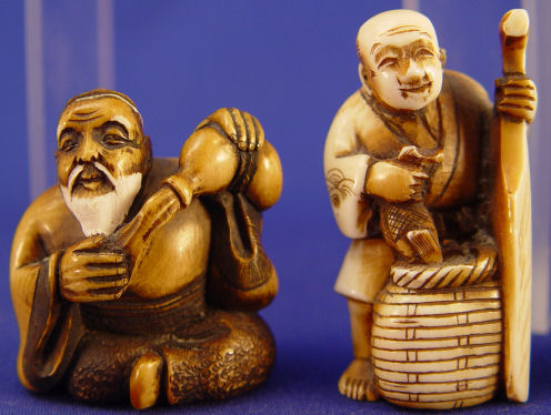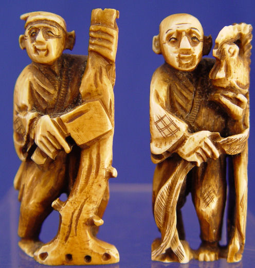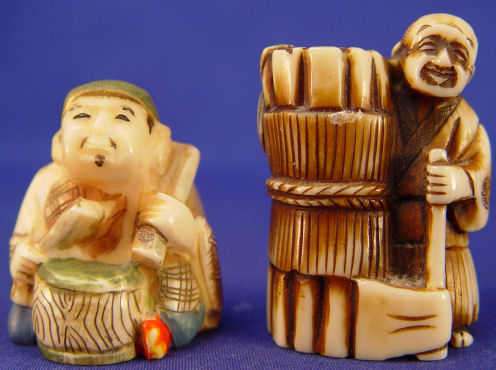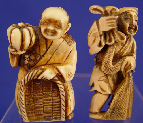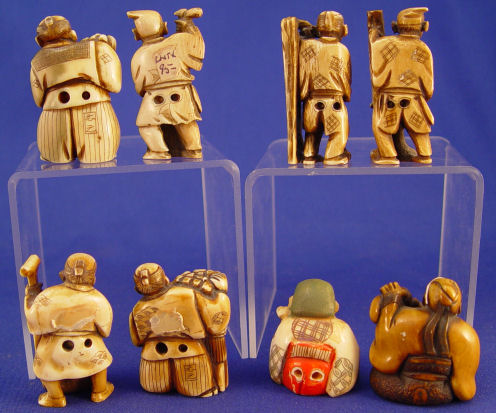 8 IVORY SMALL NETSUKES: To include 1) Man with cleaver, signed on base, 2 1/8'' tall. 2) Man with pumpkin and basket, signed on back 2 1/8'' tall. 3) Man with fish, basket and paddle, unsigned 2 1/8'' tall. 4) Man seated with drum, handpainted hat, drum and legs, signed on base 1 1/2'' tall. 5) Man with crops and ax, signed on back, 1 7/8'' tall. 6) Man with fishing net, signed on base, 2 1/8'' tall. 7) Man with long feathered chicken, signed on base, 2 1/8'' tall. 8) Man seated with jug, signed on back, 1 3/4'' tall.