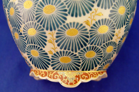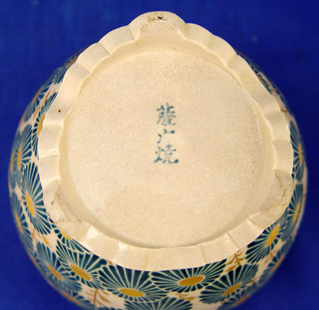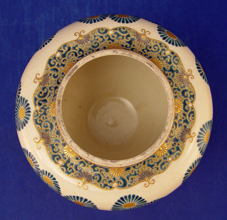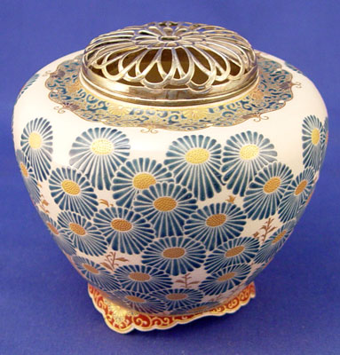 SIGNED JAPANESE SATSUMA INCENSE BURNER: Reticulated silverplate cover on earthenware Satsuma jar, COVERED VASE: Open work top. 5 1/4 tall, 5 1/2 dia.overall.