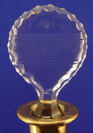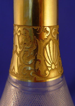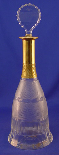 MOSER ''SPLENDID'' GOLD ENCRUSTED CUT GLASS DECANTER: Gold encrusted neck with cameo frieze from the Splendid line by Moser Glass. Heavy cut glass body. Oval mark still present on base of decanter, however no Moser mark. Measures 15 1/2'' tall with glass stopper. 5 3/8'' dia at base.