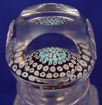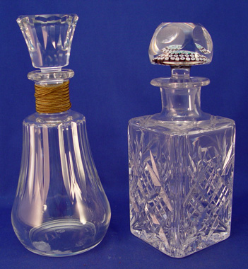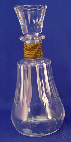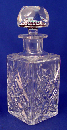 2 BACCARAT CUT GLASS CRYSTAL DECANTERS: 1) Made for Bisquit Napoleon Cognac. Marked clearly on bottom with Baccarat logo. Gold woven cord around neck. Please note glass sickness on inside base. 10 1/4'' high. 2) Unsigned cut glass decanter with millefiori floral decoration inside glass stopper. Appears to have date 1877 in one of the flowers. 9 3/4'' high.