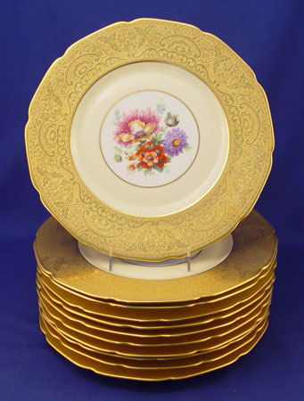SET OF ELEVEN HEINRICH & CO. SERVICE PLATES: Bavarian plates decorated in the US in 22K gold. 10 1/2'' dia.