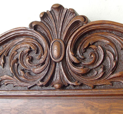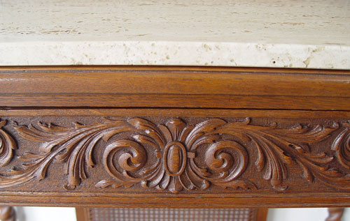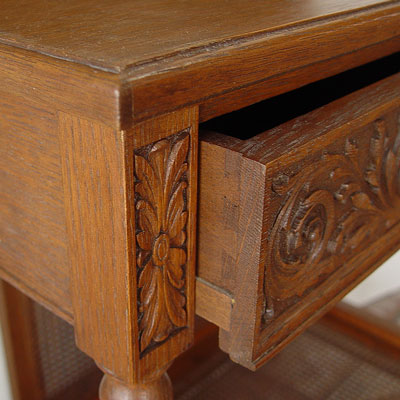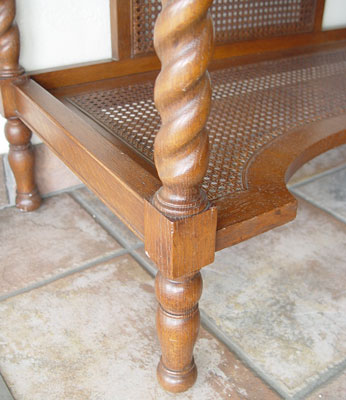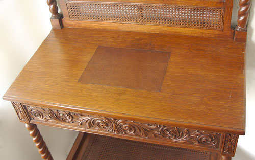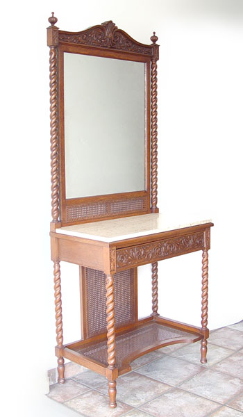 OAK HALL TABLE WITH MIRROR: Barley twist legs and side supports, single drawer with carved front, matching carving to crest, shaped bottom shelf, cane inserts to bottom of mirror and back of stand, 76''h. x 31'' x 17 1/2''d.