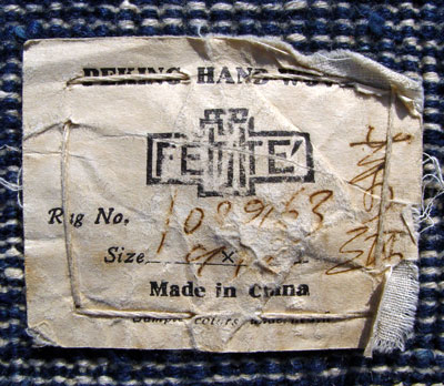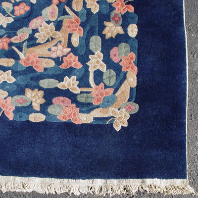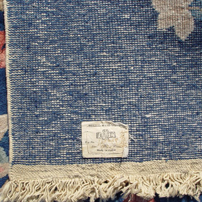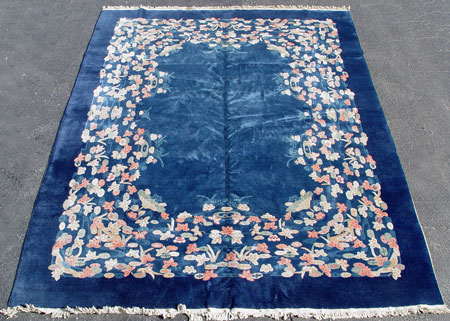 CHINESE DECO FETTE CARPET WITH TAG: Made in Peking. Floral design on blue ground. Approx. 9'1'' x 11'9''.