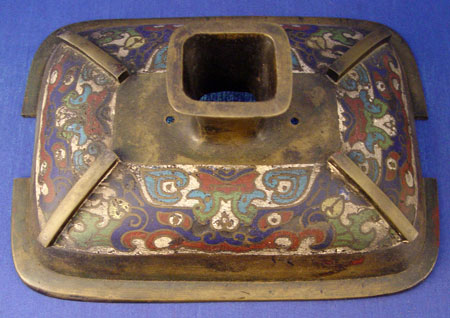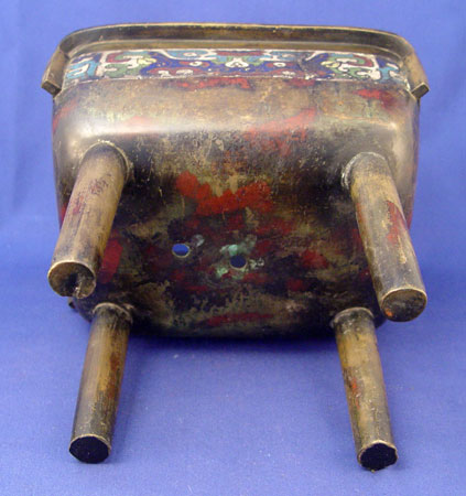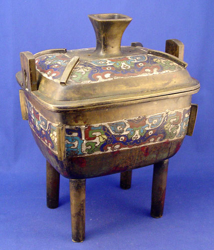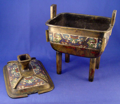 LARGE CHINESE BRONZE CHAMPLEVE CENSOR: Four legged pot with handles and cover. 14''h. x 10 1/2'' x 8''.