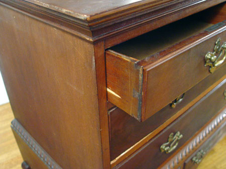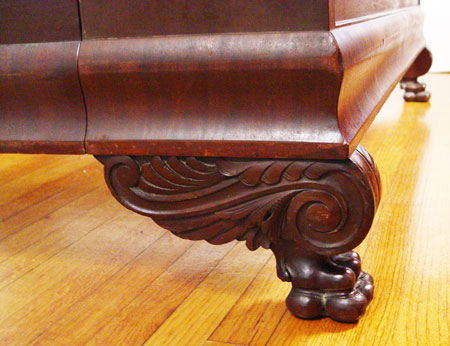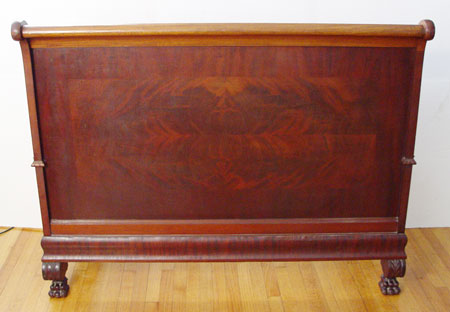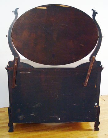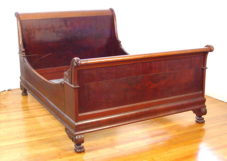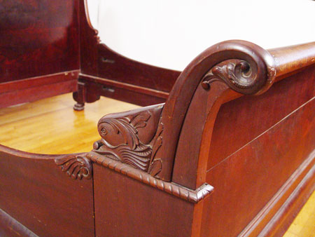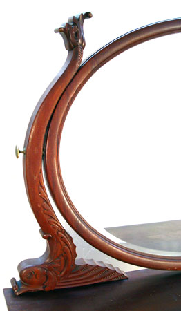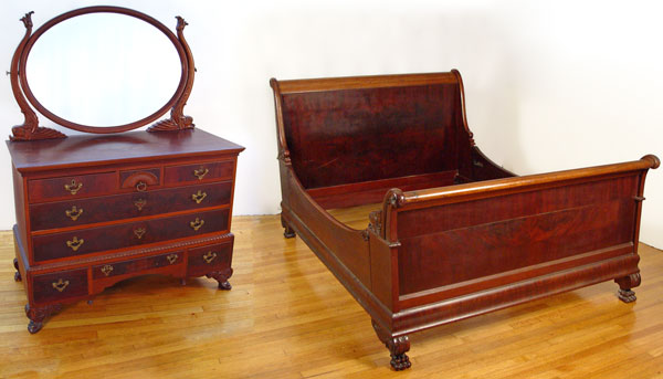 FINE 19TH C DOLPHIN CARVED MAHOGANY SLEIGH BED AND CHEST WITH MIRROR: Featuring carved paw feet, gadroon trim and dolphin forms. DRESSER with oval beveled mirror supported between dolphin harps. Three small drawers over two center drawers over three small drawers across the base. Full size SLEIGH BED with matching paw feet and dolphin design. Headboard is 45 3/4''h., Foot is 33 1/2''h. Rails included.