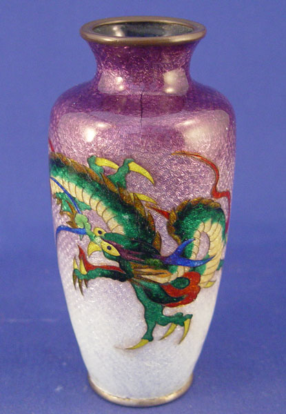 JAPANESE GINBARI CLOISONNE VASE: Dragon design on a purple faded to lavender ground. Some discoloration around the dragons bottom. 6''h, unsigned.