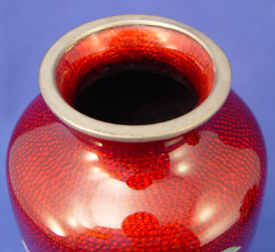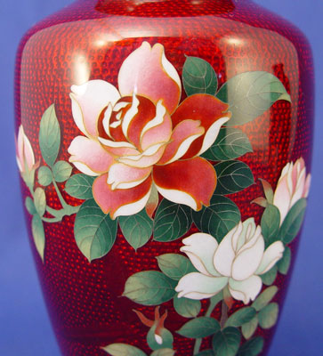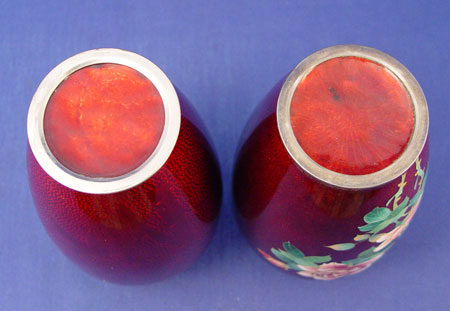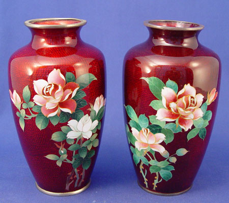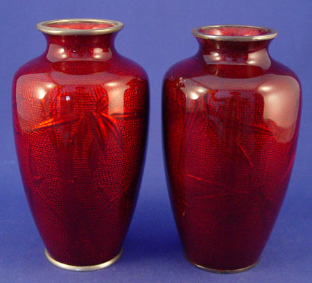TWO JAPANESE PIGEON BLOOD GINBARI CLOISONNE VASES: 1) Rose design, bamboo ground, the base is marked ''Made in Japan, 7''h. 2) Rose design on bamboo ground, base marked ''Silver'', please note chips under rim, 7''h.