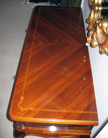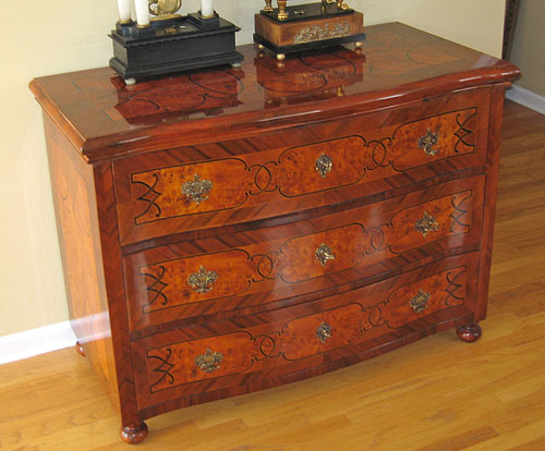 INLAID SATIN WOOD 3 DRAWER CHEST: Dramatic combination of striped and burled veneers with ebony accentuations, 3 serpentine drawers, bun feet. 37''h. x 49'' x 23''.