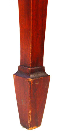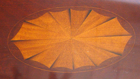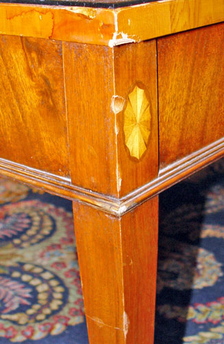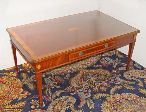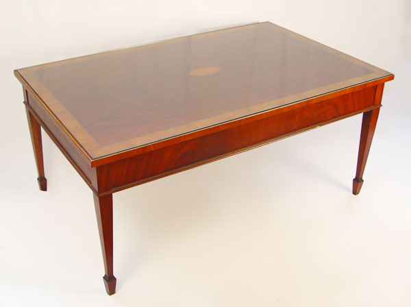 MAHOGANY PATERA INLAID COFFEE TABLE: Generous size top protected by glass, spade legs, 21 1/2'' high x 47 1/2'' x 29 1/2''. Please note some small chips on left side - under top corner and along outer edge of leg.