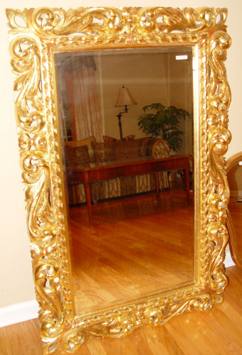 LARGE CARVED & GILT WOOD MIRROR: Carved in repeating scrolls, beveled glass, wood panel back. 51'' x 33''.