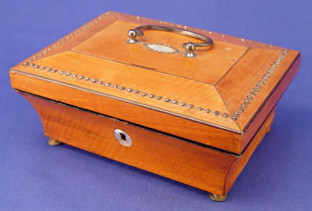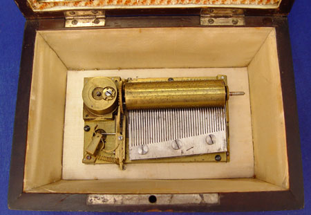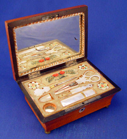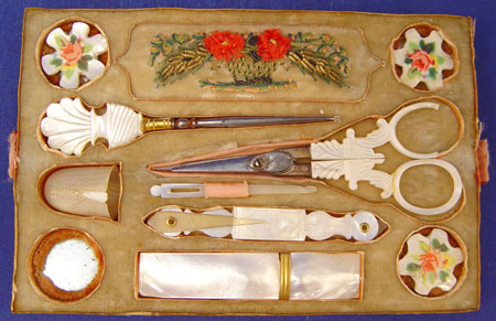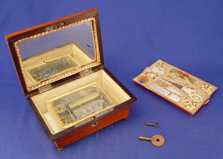 19th C MOTHER OF PEARL SEWING KIT IN MUSIC BOX: Self contained sewing kit fitted into a velvet lined box. Scissors (loss of MOP in handle), thimble, needle case, hole punch, thread winding stars, and pin cushion. The interior of the box is velvet lined with mirror on the top. The exterior has metal beading and mother of pearl escutcheon. The winder to the music is not there. 2 1/2''h. x 6 1/4'' x 4 1/2''.