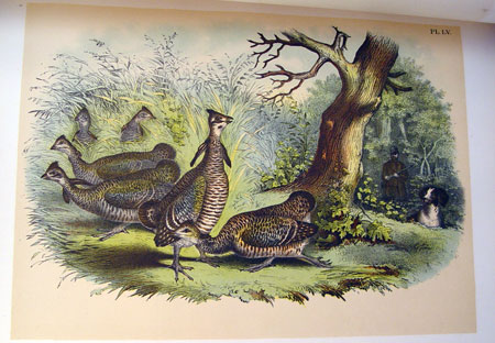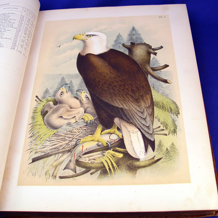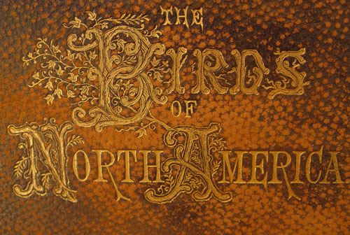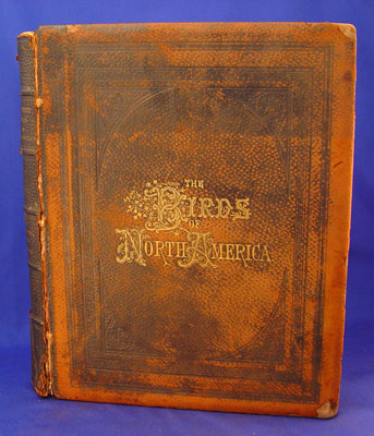 JACOB STUDER THE BIRDS OF NORTH AMERICA 1888: 119 artistic colored from nature plates representing different species and varieties, and text describing habits and attributes. 182 pages plus plates and index on scientific and common names. All pages complete, very minor foxing to some page edges, text and plates nice and clean. Hardcover bound in Moroccan leather. Binding intact, complete cover. Some wear spots and splits to leather.