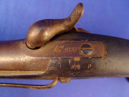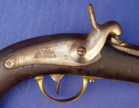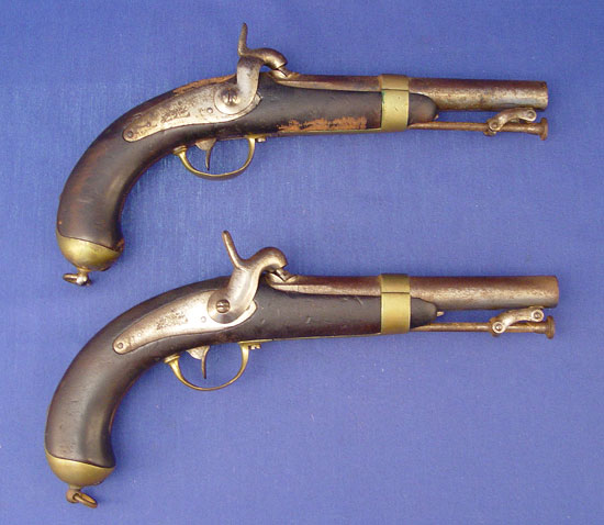 PAIR 1837 FRENCH MARINE PERCUSSION PISTOLS: Percussion, well marked Chatellerault and 1837 date. Inspector stamp FT at butt of one pistol. Touchmarks on brass understrap and butt. Barrel length 6 5/8'', overall length 11 3/4''. Please note age stain to metal and condition of stocks.