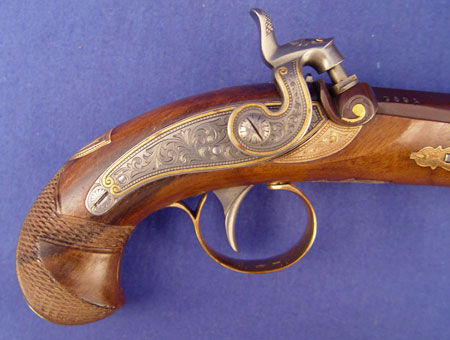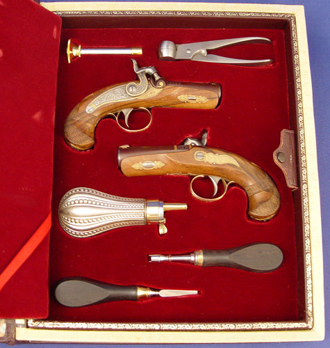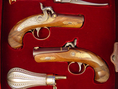 HENRY DERINGER COMMEMORATIVE CASED PISTOLS: High grade set by the US Historical Society. Only 100 pairs made. 14k gold mounts and hand engraving. Cased in book with tools. Comes with COA and instructions.