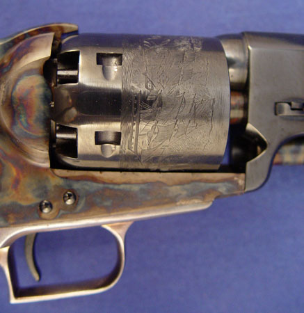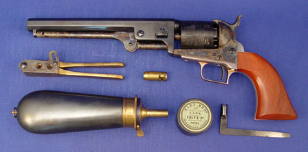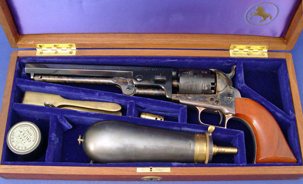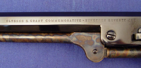 COLT ULYSSES S GRANT COMMEMORATIVE NAVY REVOLVER: 1971 in overall mint condition. Brilliant case color. Left side of barrel stamped ''ULYSSES S. GRANT COMMEMORATIVE-NINETEEN SEVENTY ONE''. Comes in original walnut case with blue lining. Accessories include bullet mold, powder flask.