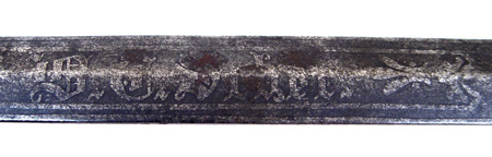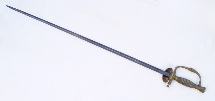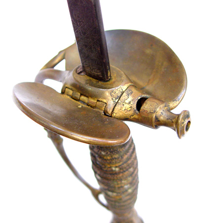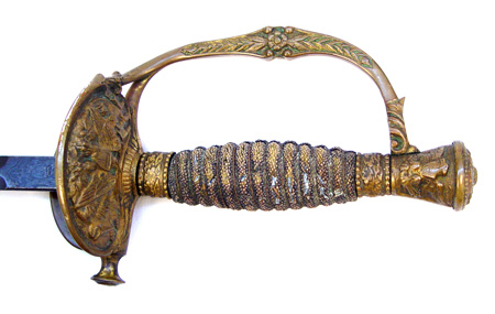 1860 STAFF & FIELD OFFICERS PARADE SWORD W/ WHISTLE: Rare parade model with whistle on guard. Circa 1870-1890. Marked Pettibone Bros Mfg. Cincinnati O. on ricasso. Reverse stamped with bear and Made in Germany. Etched military and floral decoration and owners name on dark 31 3/4'' blade. Some pitting lower tip area. Hilt has some minor looseness, wear to original sharkskin wrap, original wire present. Folding counter guard.