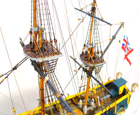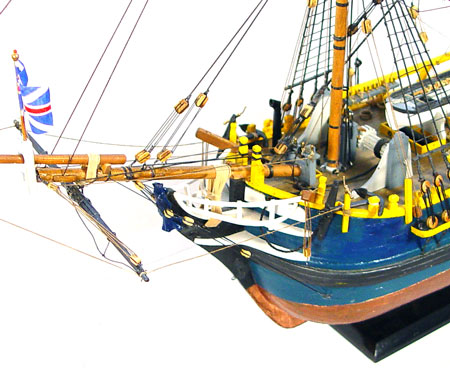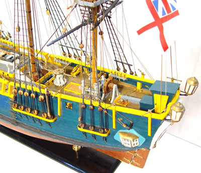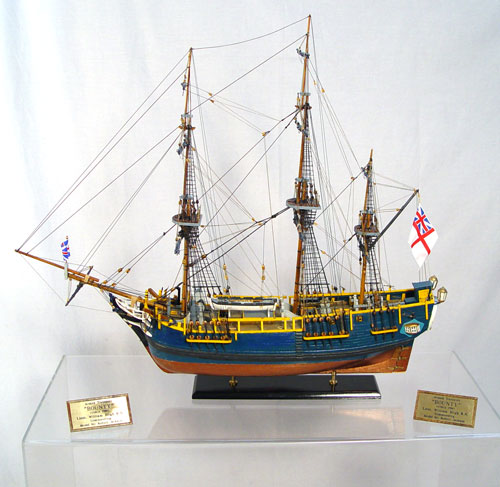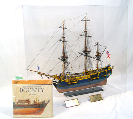HANDMADE HMS BOUNTY SHIP MODEL: Fine detail handmade and painted by consignor. Ship measures 26 3/4'' high x 30 '' long x 6 1/2'' deep. Comes with HMS Bounty book by John McKay and plexiglass cover. Cover measures 28 1/2'' high x 32'' wide x 14'' deep.