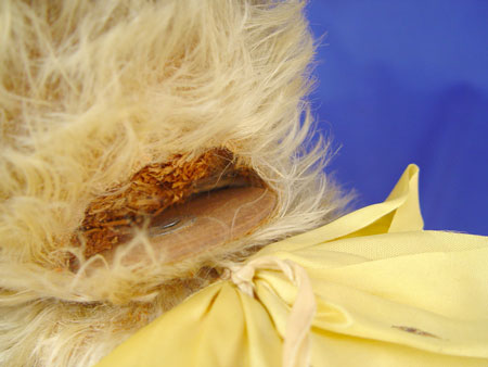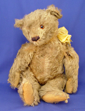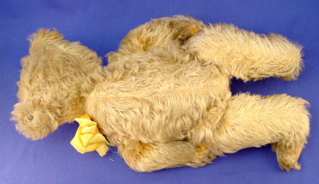 EARLY 20TH CENTURY STEIFF TEDDY BEAR: Circa 1920's with 8mm button still in ear, no tag. 18 1/2'' high. Articulated shoulders and hips. Threaded nose. Sawdust stuffing in good shape. Mohair material, glass eyes. Four claws on paws. Yellow ribbon attached to neck. Please note condition.