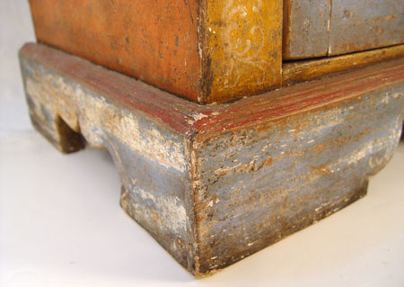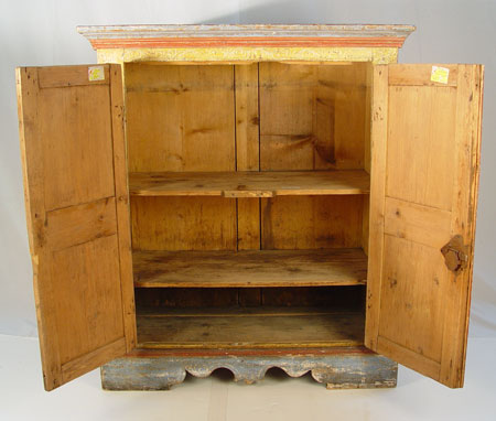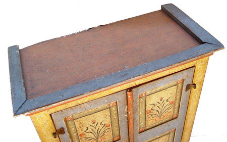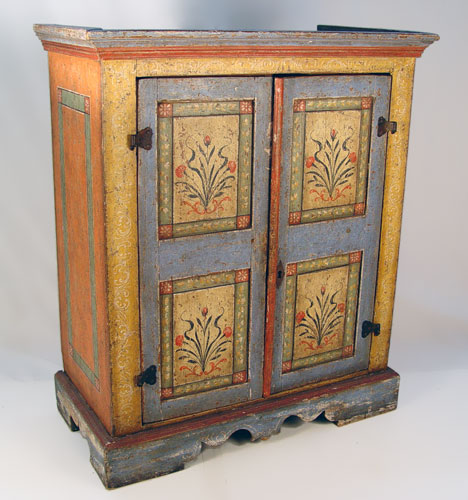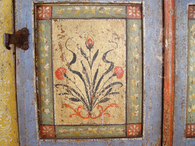 COUNTRY FRENCH PAINT DECORATED CABINET: Distressed painted finish. Sticker inside door ''Made in France'' 39 3/4'' high x 34 1/8'' wide x 17'' deep.