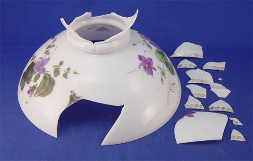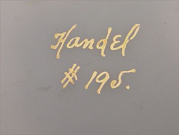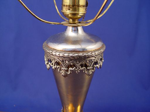 ELECTRIFIED HANDEL LAMP BASE: Copper, brass and silver metal. It will hold a 10'' dia. shade. Fragments of original shade signed ''Handel 195'' are included. Base measures 13 1/2'' high.