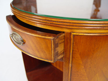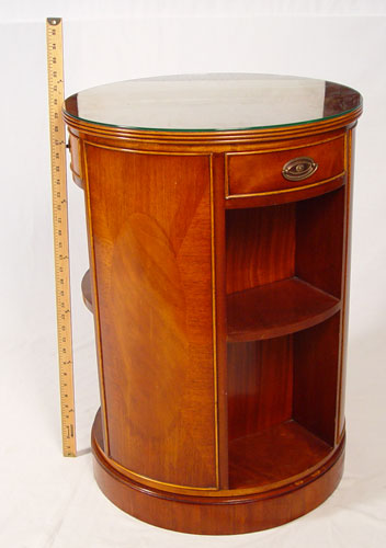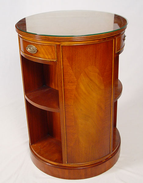 REVOLVING BOOKCASE SIDE TABLE: Geometric pattern inlay, 3 drawers, 30 1/2''h. 21 1/2'' dia. Protective glass top.