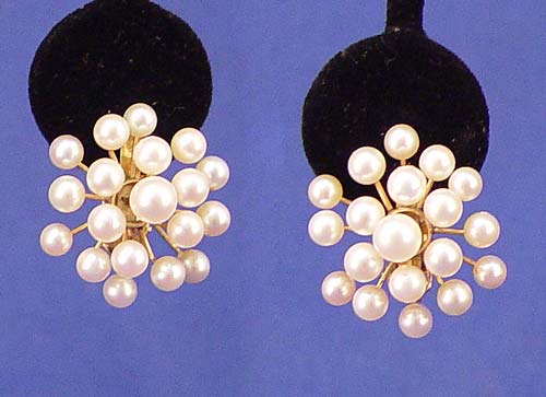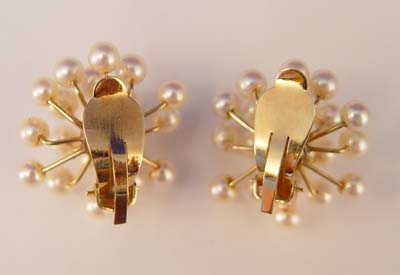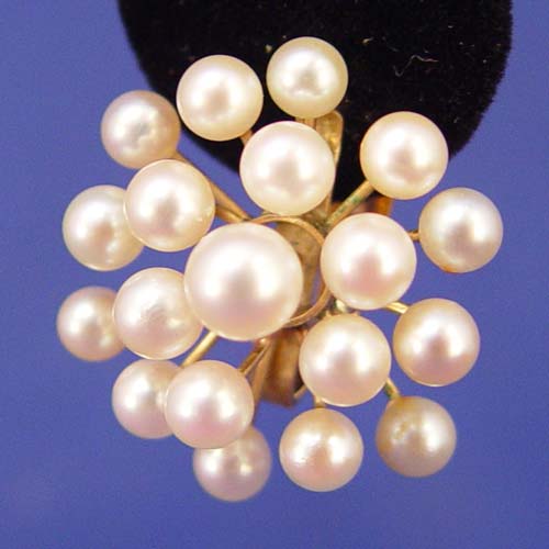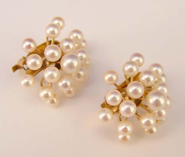 14K CULTURED PEARL CLUSTER EARRINGS: 14K yellow gold earrings with 40 4.00 - 5.50 mm cultured pearls. Light cream in color, slightly blemished, high luster. The half drilled pearls are peg set on wire in a sunburst pattern. Hinged clip closures. Approx. 1'' in diameter. Weight: 9.4 grams.