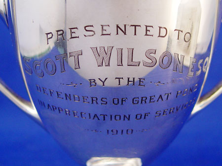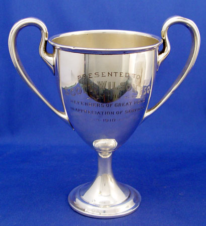 1910 GORHAM STERLING TROPHY: Inscribed presentation to Scott Wilson Esq. by the ''Defenders of the Pond 1910''. 9 1/4'' tall x 8 5/8'' across. Please note slight dings in handles, base. Approx. 13.6 troy oz.