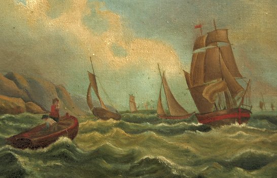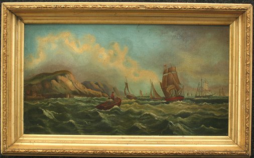 19TH C MARITIME COASTAL SCENE: Ships at Sea, probably off the Cornish Coast, Oil/Canvas, 10'' x 18'', no visible signature, encased in gilded frame with over-paint and wear, 13'' x 20 1/2''. Needs cleaning, some in-painting in upper right corner.