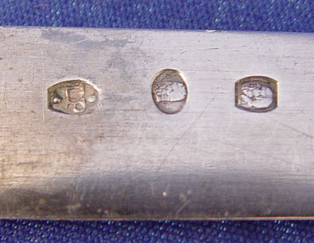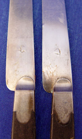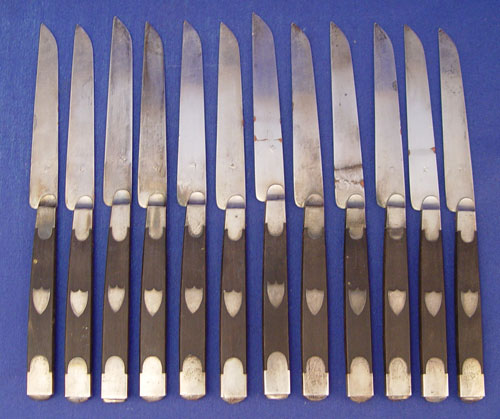 12 FRENCH PROVINCIAL EBONY & SILVER KNIFE SET: 12 knives with ebony handles and 800 silver blades and decoration. French provincial marks on blades. Measure 7 3/4'' in length.