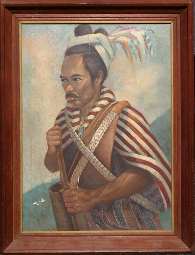 20TH C PORTRAIT OF A POLYNESIAN / HAWAIIAN WARRIOR: Oil/Board, 22'' x 16'', illegibly signed, encased in worn wood frame, 26'' x 20''. Several abrasions, cracklure throughout, needs cleaning.