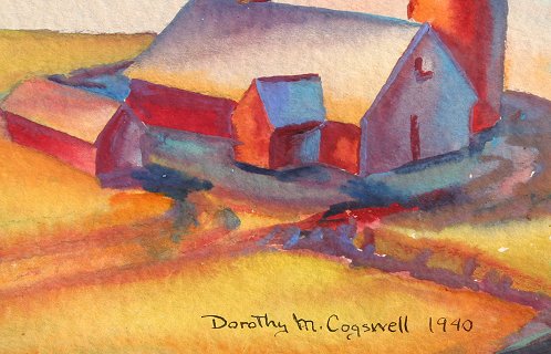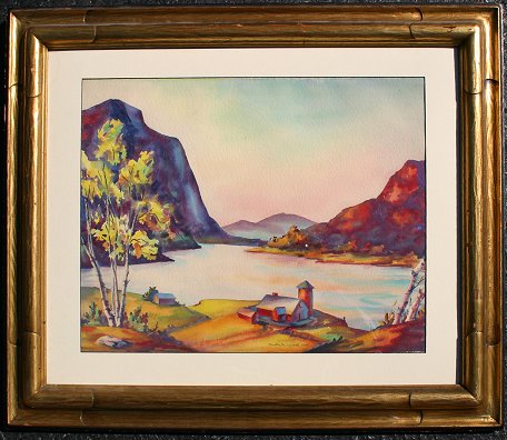 COGSWELL, Dorothy (American, 1909-): Serene Lakeside Sunset Landscape, Watercolor, sight size 14 1/2'' x 18 3/4'', signed and dated 1940, encase period gilded and carved American impressionist frame with wear, 23'' x 27 1/2''.