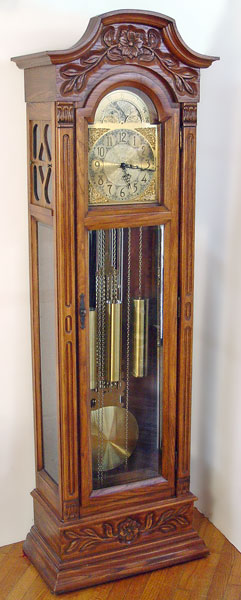 WEST GERMAN OAK CASE GRANDFATHER'S CLOCK: Westminster chimes, 5 pipes, 3 weights. Works marked ''Urgos Made in Germany''. Measures 79'' tall x 24 1/2'' wide x 13 1/2''.