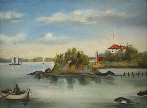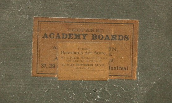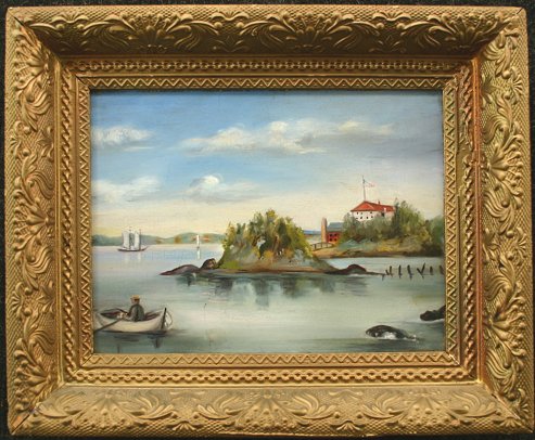 PRIMITIVE / NAIVE 19TH C LAKESIDE SCENE: Oil/Board, 9 1/4'' x 12 1/4'', embossed gesso frame with over-paint, scene depicts a man rowing in the foreground with sailboats in the distance and a home on the shore flying an American flag, Canadian label from Reardon's Art Store Halifax Nova Scotia with a Montreal Academy under that verso. Several minor abrasions with cracklure throughout.