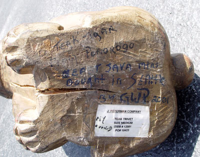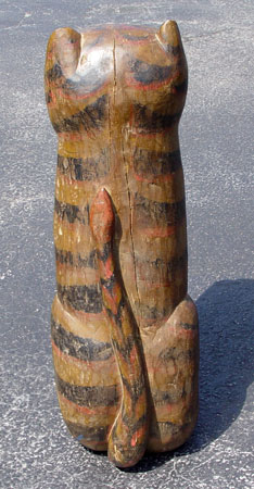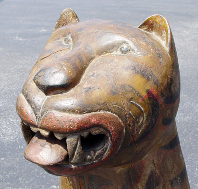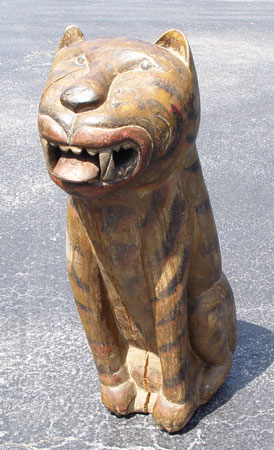 CARVED TEAK TIGER: From the town of Pono Rogo, known for tigers. Tag on bottom from J. Peterman & Co. 32 1/2'' tall. Please note cracks in face and chest.