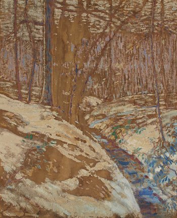 HUBBARD, Whitney Myron, (American 1875-1965): Winter Stream Landscape, Oil/Canvas Board, 30'' x 24 3/4'', faintly signed, wooden frame with fabric mat, 35'' x 30''. Extensive paint loss with moisture damage, sold as is.