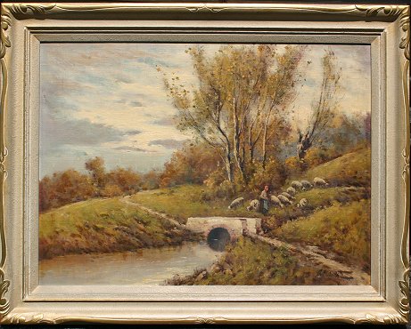 ILLEGIBLE SIGNED LANDSCAPE OF SHEPHERDESS AND HER FLOCK OF SHEEP: Oil/Canvas/Board, 23'' x 31'', carved and gesso frame, 30'' x 38''. Est. $300/500**