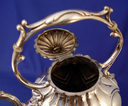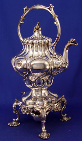 REED & BARTON SILVERPLATE HOT WATER KETTLE ON STAND: Impressive ornate kettle can be removed or tilted on stand. Footed stand holds wick and oil to keep water hot. Dragon design pour mouth and acorn finial on hinged lid. Marked on bottom of kettle '' Design Patented Jan 12 1858 Reed & Barton 1919 8''. 16 1/4'' high x 9 3/4'' wide overall with stand.