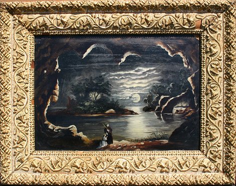 19TH C PRIMITIVE NOCTURNAL SCENE PAINTED FROM A GROTTO: Oil/Board, 10 1/2'' x 14 3/4'', embossed gilded gesso frame with missing gesso, 16'' x 20''. Needs cleaning, fleck in left margin. Est. $300/500**