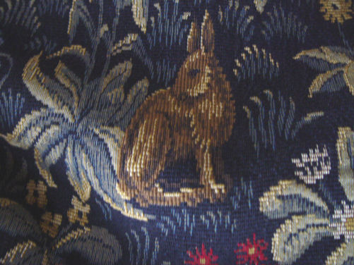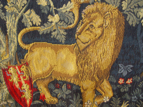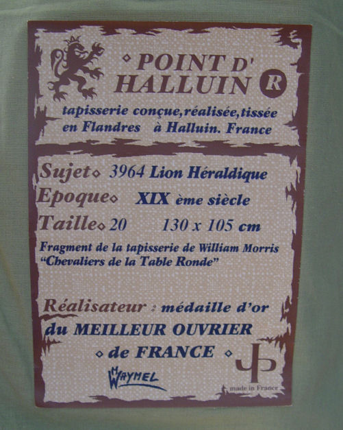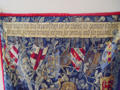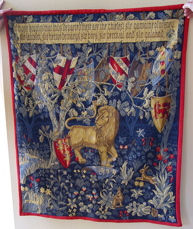 FRENCH TAPESTRY HONORING THE KNIGHTS OF THE ROUND TABLE: Made in France this is a fragment copy from an original by William Morris, British artist and designer. Depicts the Quest for the Unicorn by the legendary twenty-four Knights of King Arthur. The lion represents the most courageous knights who, having hung their shields in the woods, have departed on their mission to find the Unicorn. ''Chevaliers de la Table Ronde''. Complete with rod for wall mount. 4' x 3'4''.