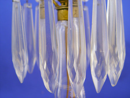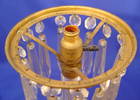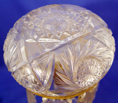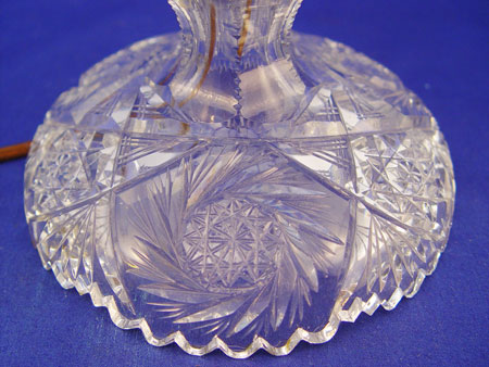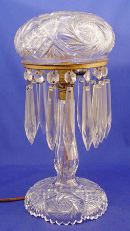 AMERICAN BRILLIANT PERIOD CUT GLASS BOUDOIR LAMP: Glass shade and base, unsigned with swirl designs on base and shade. Missing one luster. 13'' high.