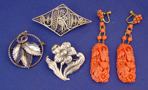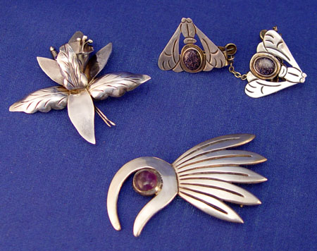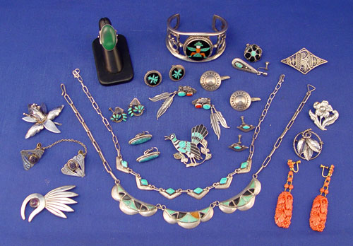 ESTATE LOT OF MEXICAN & INDIAN SILVER JEWELRY: Mexican sterling items to include abstract bird brooch set with a cabochon amethyst, marked JH, approx. 2.5''; abstract bug motif sweater clip set with unknown sparkle stones, marked LaGuadalupana around FC; orchid brooch marked Taxco RCH 3 eagle, 2 1/8''. Native American Indian items to include, Zuni Edward Beyuka inlaid road runner brooch signed EAB Zuni, approx. 1 5/8'' x 1 7/8''; large Zuni? inlaid cuff bracelet, unmarked, opening approx. 2 3/4'' x 2''; etched cufflinks marked Sterling; 3 pairs of screw and clip back earrings set with turquoise, marked Sterling; clip back earrings set with turquoise and coral and feather dangles, unmarked silver content, 2 3/8''l.; panel necklace inlaid with turquoise and onyx (missing one piece of onyx), unmarked, 1 71/2''l.; necklace and matching earrings, set with turquoise, necklace unmarked, 17''l., screw back earrings marked Sterling; unmarked silver rings set with large cabochon of malachite?, size 6.5; also a couple